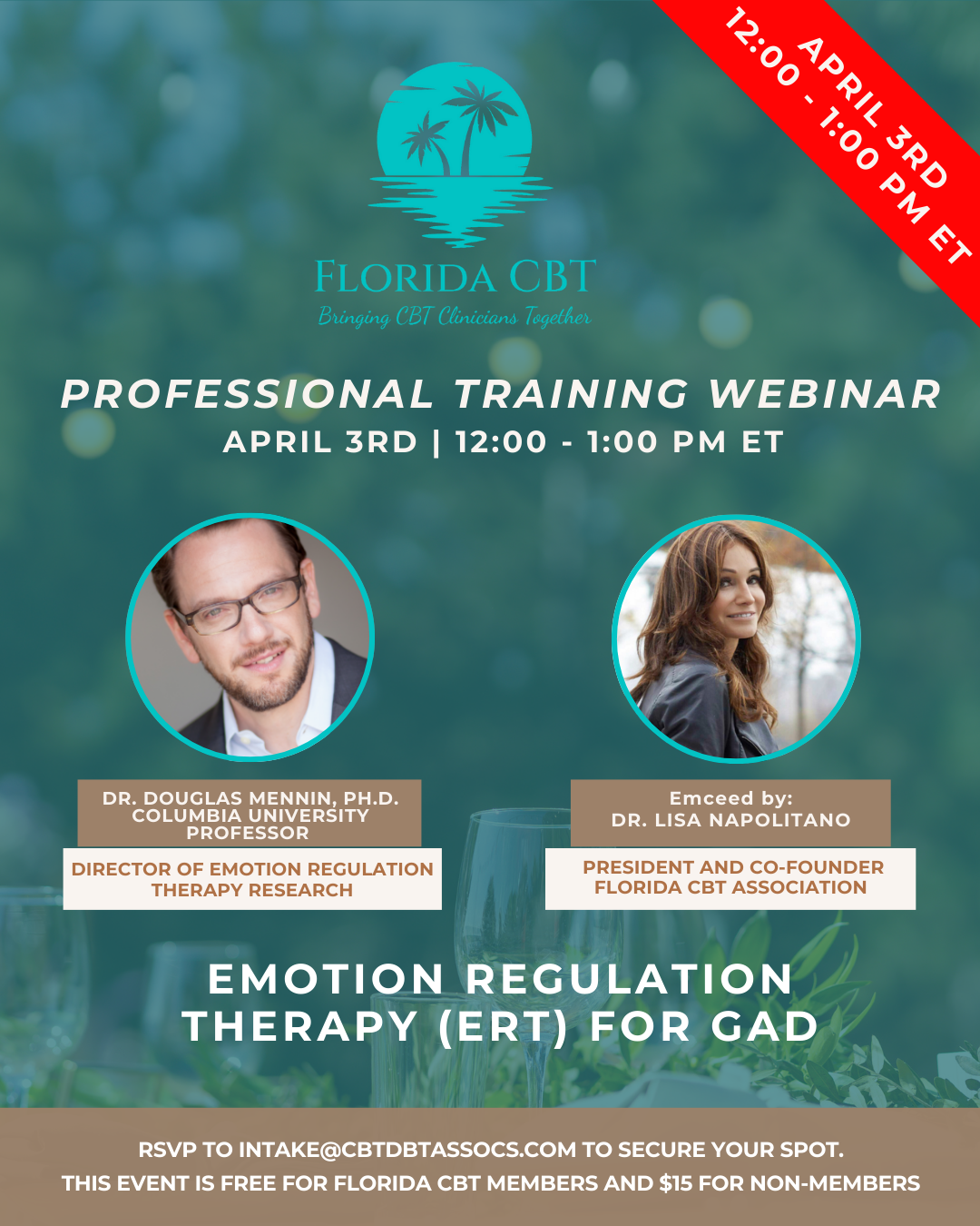 April 3 | 12–1 PM ET Dr. Douglas Mennin Ph.D. has developed an active program of research in clinical trials and basic research into the nature of chronic and recurring bouts of anxiety and mood disorders, particularly worry, stress, and depression. He has examined these problems from a perspective that highlights the importance of one’s… Continue reading Emotion Regulation Therapy (ERT) for GAD