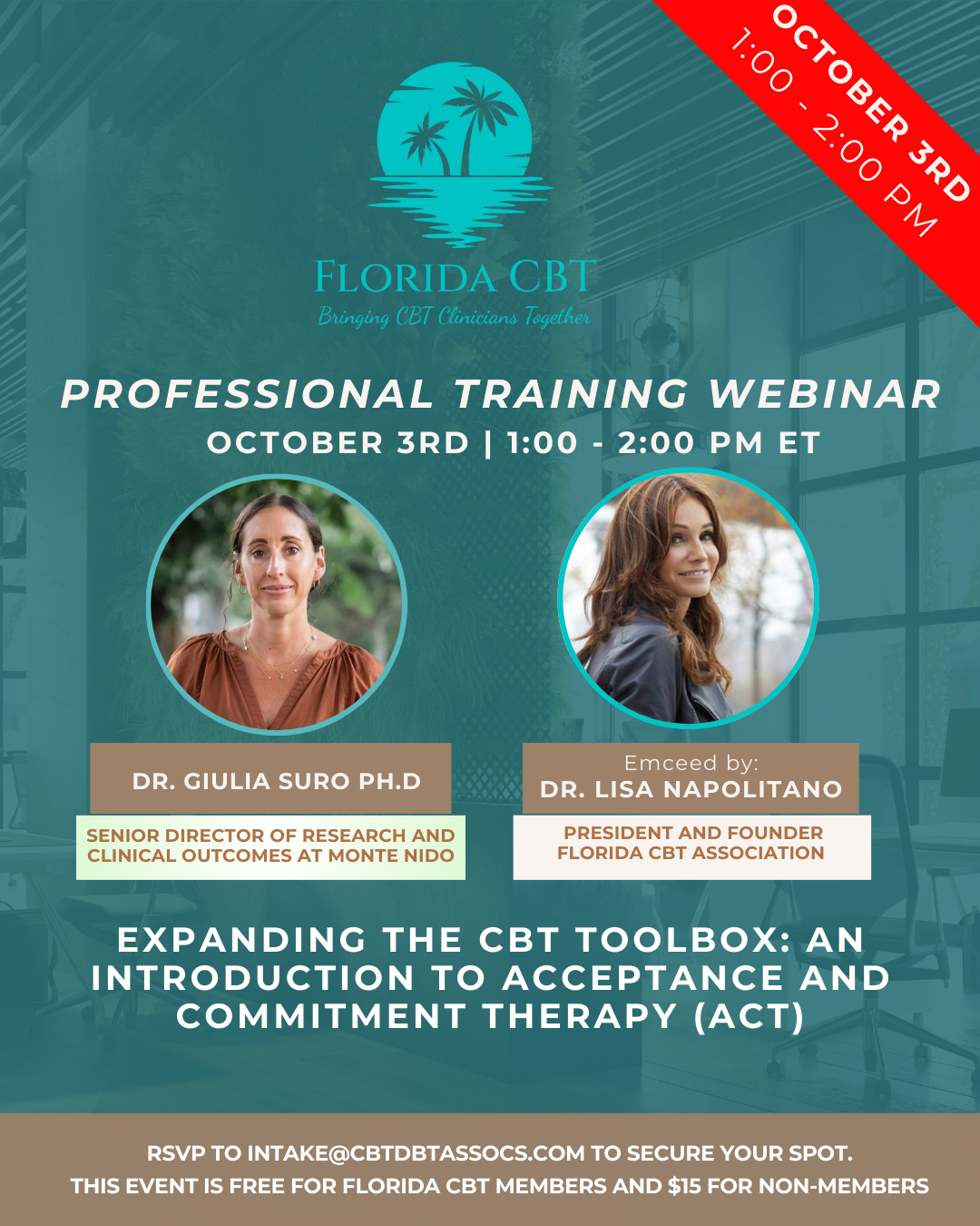 October 3rd | 1:00–2:00 PM ET Dr. Giulia Suro, Ph.D., CEDS, is a psychologist, author, and Senior Director of Research and Clinical Outcomes at Monte Nido. Her work has been featured in Slate, Teen Vogue, and Psychology Today, and she has published extensively in leading journals including the International Journal of Eating Disorders, European Eating Disorders Review, and Eating Disorders: The… Continue reading Expanding the CBT Toolbox: An Introduction to Acceptance and Commitment Therapy (ACT) – October 3rd